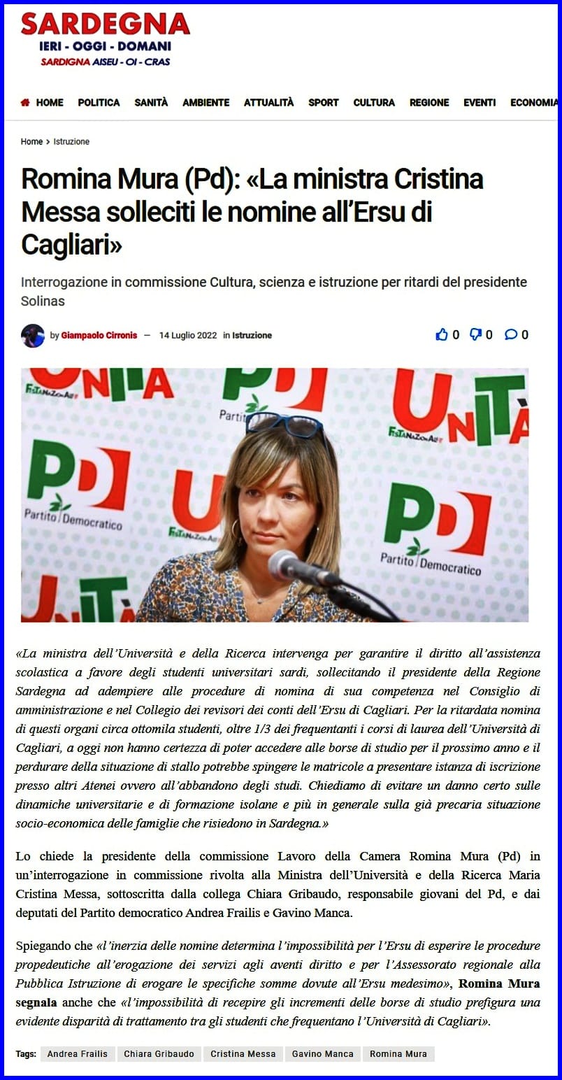 - Romina Mura (Pd): «La ministra Cristina Messa solleciti le nomine all’Ersu di Cagliari»